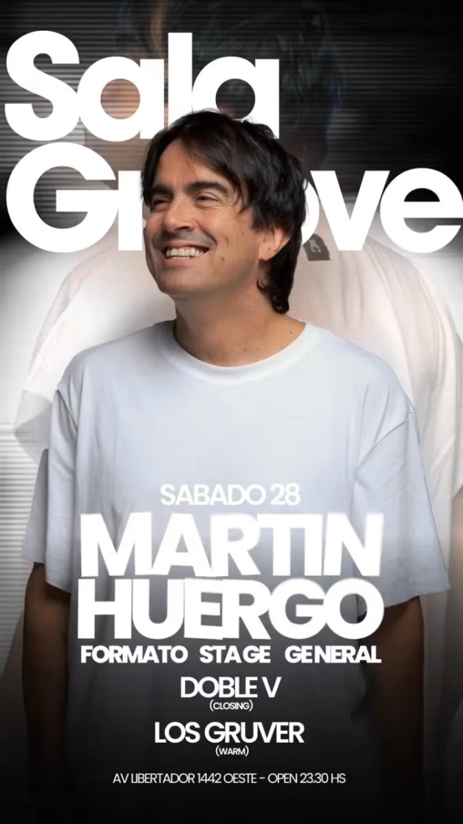 Noche electrónica con Martin Huergo como headliner, acompañado por Los Gruver (warm up) y Doble V (closing).